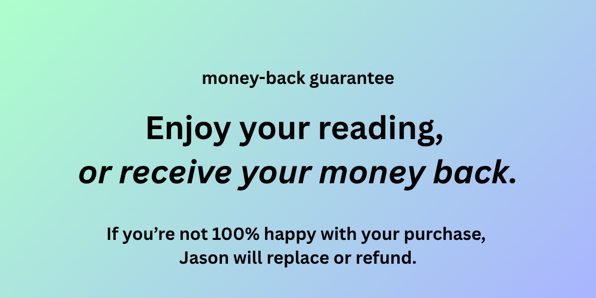 Receive detailed information, channeled from Spirit, in a written reading. Written reading are a minimum 250 words in length and have a 24-hour turnaround. Choose what area of life you would like Spirit to focus on: your professional life, personal life, or health. Jason's work is heart-centered and non-invasive.